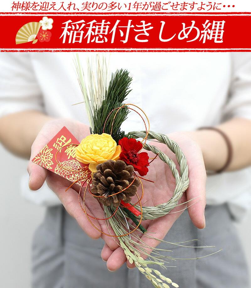 商品説明使用花材 穂付きしめ縄、ジニア、ソーラーローズ、松、松ぼっくり、迎春ピック、水引、その他副材は写真と異なる場合がございます。