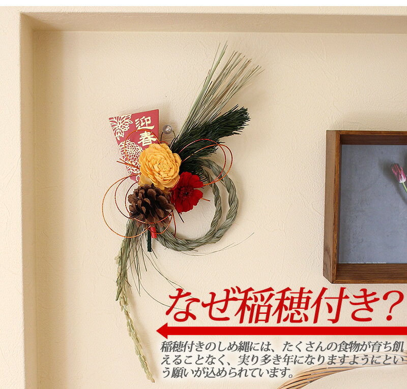 送料無料 プリザーブドフラワーの稲穂付きしめ縄 写真印刷無料 お正月 飾り 和風 招福門松 謹賀新年 お年賀 三が日 年末年始 迎春